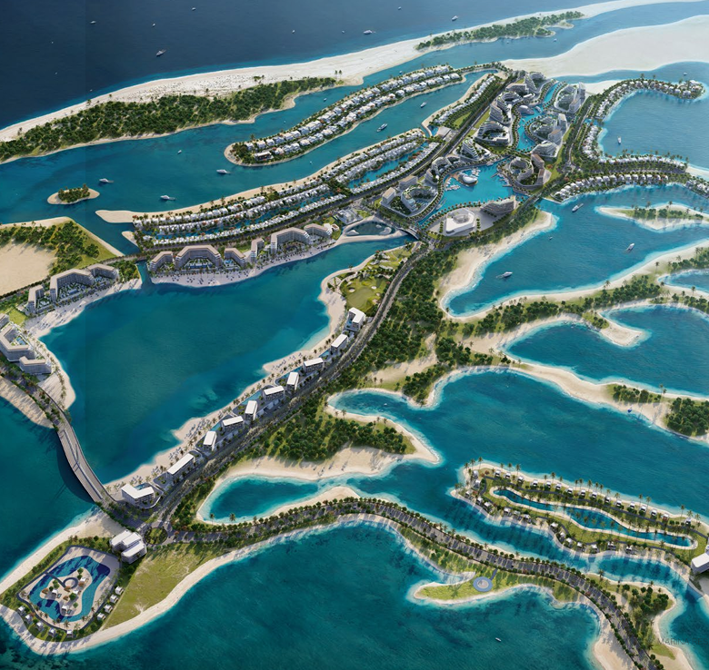 What on-site amenities are included? Key amenities include a marina and boardwalk, yacht club, beach club, private pools, golf course, helipad/air-taxi connectivity, freshwater lagoons and nature conservation areas — a resort-style package.